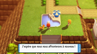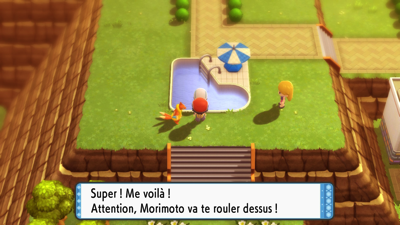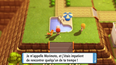 Ressortez puis allez retrouver l'homme en maillot, barbotant dans sa piscine. Il s'agit de l'éternel Morimoto de GAME FREAK que vous pouvez défier.
