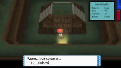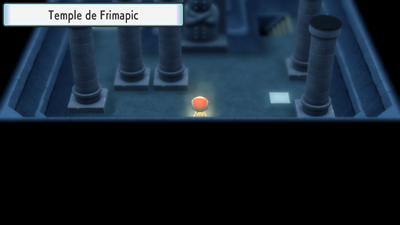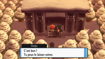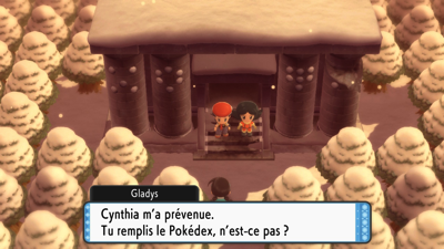 Si cette tâche est déjà effectuée, continuez jusqu'au Temple de Frimapic, tout en ayant sur vous les trois Pokémon Golems. La Topdresseuse à l'entrée ne souhaitant toujours pas vous laisser passer, Gladys arrive à ce moment-là et vous laisse l'accès pour que vous puissiez remplir votre Pokédex (sur les ordres de Cynthia).