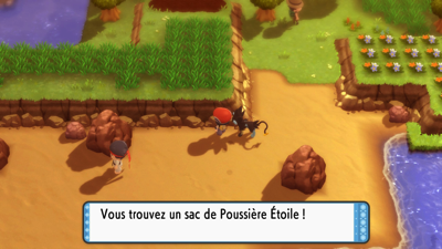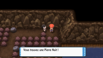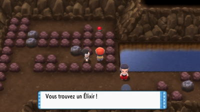 Continuez votre progression jusqu'à atteindre deux autres dresseurs ainsi que deux objets : un Élixir (objet de droite) et une Pierre Nuit (objet du haut). Notez que vous devrez sortir de la grotte et y revenir pour pouvoir obtenir ces deux objets.