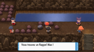 Continuez vers l'est pour tomber sur deux autres couples de dresseurs et récupérer un Rappel Max (caché dans un rocher).
