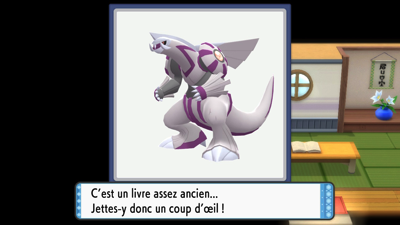 Maintenant, il ne vous reste plus qu'à obtenir les données du Pokémon légendaire exclusif à l'autre version. Pour ce faire, rendez-vous à Célestia, chez la grand-mère de Cynthia et parlez-lui pour obtenir les informations du légendaire de la version opposée (Palkia si vous jouez à Diamant Étincelant ou Dialga si vous jouez à Perle Scintillante).