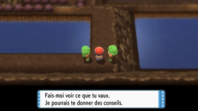 Enfin, battez le dernier couple de dresseurs présents, puis sortez en remontant vers le nord-est. Prenez les escaliers et sortez pour arriver sur la Route 224.