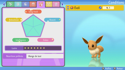 Chaque Pokémon peut avoir entre 0 et 255 de condition dans chacune des statistiques Sang-Froid, Beauté, Grâce, Intelligence, Robustesse. Si vous participez aux concours Beauté par exemple, ce sera la condition de Beauté de votre Pokémon qui comptera principalement. Ces conditions s'améliorent en lui donnant des Poffins. Vous trouverez ci-dessous le nombre de points gagnés dans la catégorie en fonction de la condition associée.Condition/Lustre Points 250-255 +1000 240-249 +975 230-239 +950 220-229 +925 210-219 +900 200-209 +860 190-199 +830 180-189 +800 170-179 +760 160-169 +730 150-159 +700 140-149 +660 130-139 +630 Condition/Lustre Points 120-129 +600 110-119 +560 100-109 +530 90-99 +500 80-89 +450 70-79 +400 60-69 +350 50-59 +300 40-49 +250 30-39 +200 20-29 +150 10-19 +100 0-9 +0