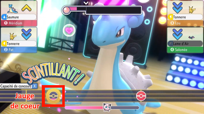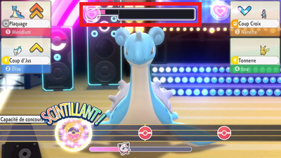 Durant la présentation, lorsque votre Pokémon sort de sa ball, des coeurs apparaîtront pour indiquer le score à l'épreuve de style ! Les gros coeurs sont équivalents à 5 petits coeurs, et le score maximum est de 23 petits coeurs.