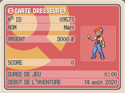 La Carte Dresseur sert à indiquer divers informations vous concernant : votre n° d'ID, votre nom, votre argent, le nombre de Pokémon que vous avez vus, votre score, le temps de jeu total et le jour où vous avez commencé à jouer à ce jeu.