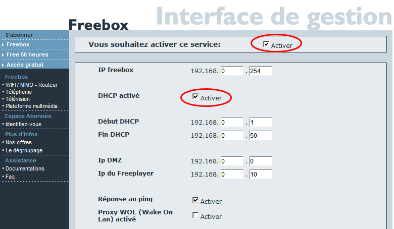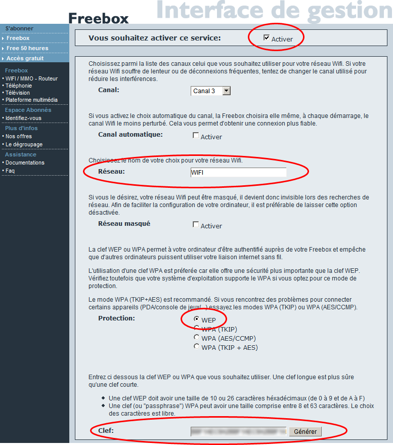 La première chose est d'activer le mode routeur et le mode Wi-Fi de la bête : tout est sur l'interface de gestion de la Freebox (http://subscribe.free.fr/login/ ). Les options proposées sur les images ne sont que des suggestions, veillez simplement à activer le DHCP (configuration automatique), évitez de masquer le réseau et choisissez obligatoirement une clé WEP pour que ça marche !