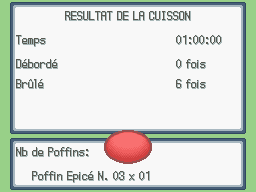 Le Poffin terminé, vous verrez alors l'écran de résultat s'afficher. Vous pourrez enfin vous rendre compte de l'efficacité de votre pétrissage. Le tableau vous présente le temps de préparation, le niveau et le type du Poffin qui a été produit.