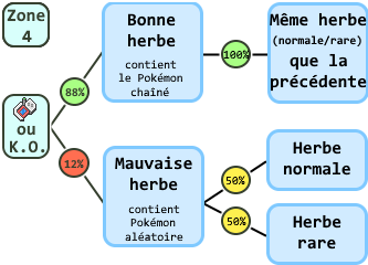 Pour le cas où vous relancez le Poké Radar ou mettez K.O. le Pokémon sauvage, la probabilité de tomber sur une bonne herbe passe à 93.6%0.88 / (1 - 0.12 * 0.5). Les 6.4%0.06 / (1 - 0.12 * 0.5) restants correspondent au cas où vous êtes tombé sur une mauvaise herbe qui s'est agité comme une herbe du même type, vous tomberez alors sur un Pokémon aléatoire de la zone, donc vous avez encore une chance de tomber sur le même Pokémon !
