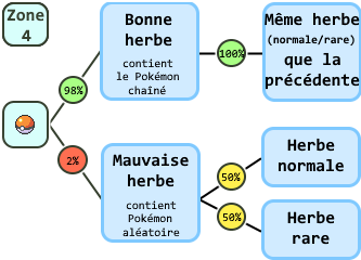 Lorsque vous ne tombez pas sur une bonne herbe, il s'agira d'un Pokémon aléatoire avec les pourcentages de la zone (en tenant compte des différences herbes normales et herbes rares). Il est donc encore possible de faire continuer la chaîne en tombant sur une mauvaise herbe, mais avec le Pokémon chaîné qui apparaît !