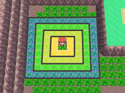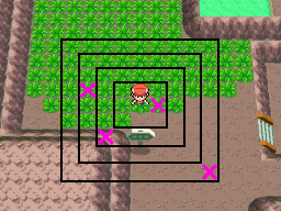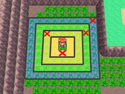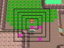 Lorsque vous utilisez le Poké Radar, des cases d'herbes vont s'agiter dans un carré de 9x9 cases autour du personnage. Ce carré est séparé en 4 zones distinctes comme sur l'image suivante :