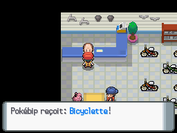 L'homme que vous sauvez au sommet est le propriétaire du magasin de vélos, retournez le voir dans sa boutique juste en dessous du Centre Pokémon pour qu'il vous offre la Bicyclette.
