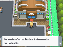 Guide de CélestiaLe brouillard se dissipe à l'arrivée dans la ville. Allez voir la grand-mère de Cynthia au Sud de la ville, elle parle d'un homme de la Team Galaxie qui sème le trouble.