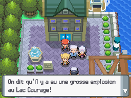 Continuez donc sur la route jusqu'au bâtiment, traversez-le pour arriver dans un hameau construit près du Lac Courage. Trouvez l'homme de la Team Galaxie, il fuira, continuez à le pourchasser jusqu'à ce qu'il vous affronte dans un combat. Il n'a qu'un Chaglam niveau 25.