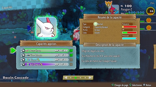 Vous trouverez la liste des capacités ci-dessous. À noter que chaque capacité possède ses propres statistiques de Puissance (pour les capacité offensive), Précision et PP. Pour les capacités offensives, plus vous les utilisez, plus elles monteront de niveau et de statistiques (chaque capacité dispose de sa propre courbe d'expérience). Le statut Bachotage donné par le piège du même nom et la Bachograine permet d'améliorer le gain d'expérience de capacité et réaliser une double attaque compte double. Avoir simplement la capacicool Boost Capacité ou faire un entraînement assidu dans le dojo Makuhita décuplent les gains d'expérience des capacités.
