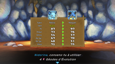 Comme dans les jeux de la série principale, un Pokémon évoluant par niveau évolue également de la même manière dans cet endroit. Pour ce qui est des évolutions spéciales (Pokémon qui évoluent via objet, échange, bonheur...), vous avez besoin d'objets appelés Géodes d'Évolution ! Vous pouvez en obtenir une fois le scénario terminé :