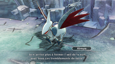 Vous escaladez donc jusqu'au sommet du Mont Acier, où vous apercevez le petit Taupiqueur apeuré. Airmure arrive peu de temps après et vous demande ce que vous venez faire ici. Votre réponse ne lui plaît pas, car elle considère que les séismes perturbant son sommeil sont causés par Taupiqueur et Triopikeur. Puisqu'elle ne veut pas écouter vos explications sur les récentes catastrophes naturelles qui touchent le Monde Pokémon, vous devrez la combattre si vous voulez pouvoir sauver la petite taupe !