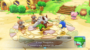 En retournant au centre de la place, vous remarquez qu'il y a de l'animation entre différents Pokémon Plante... Lombre vous explique alors que le Pokémon brun se nomme Tengalice et que lui aussi possède une Équipe de Secours, mais est principalement intéressé par l'argent. L'autre Pokémon se nomme Cotovol et lui demandait de l'aide car seul lui peut aider son autre ami Cotovol qui s'est échoué dans le Val Silencieux, une bourrasque de vent suffirait à le faire partir, mais le Pokémon Ténèbres refuse catégoriquement de l'aider.