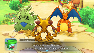 C'est alors qu'interviennent 3 Pokémon qui imposent le respect. Le meneur de l'équipe dit alors à Tengalice que ce que demande Cotovol n'est qu'un jeu d'enfant pour lui, et ce dernier accepte alors d'aider le Pokémon Vol sans broncher. Votre partenaire demande alors à Lombre qui sont ces Pokémon. Étonné par votre question, il explique alors que c'est l'équipe d'Alakazam, la plus célèbre des environs, composée de Dracaufeu, Tyranocif et Alakazam.