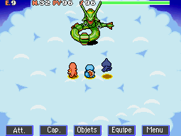 | Rayquaza est fort contre la grosse majorité des Pokémon de départ du jeu, car peu le touchent efficacement, et aucun ne résiste aux attaques Dragon. Danse Draco pourra également vous faire très mal s'il possède l'attaque. Pour en arriver le plus facilement au bout, utilisez un maximum des capacités liées pour réduire ses stats et attaquer en même temps. Recruter un Skelénox avec Entrave ou Onde Folie pourra également vous aider fortement. Il reviendra au niveau 45 avec les mêmes PV en revenant le combattre. | ||||