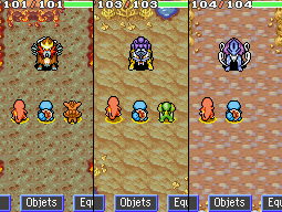 | Les trois fauves vous attendront au fond des Terres de Feu, de Foudre et Blizzard. Les deux premiers sont aisément contrables avec des Pokémon résistants à leur type principal. Suicune pourra vous attaquer à distance avec Bulles d'O et Onde Boréale. Utilisez des capacités liées pour en venir rapidement à bout, car ils pourront vous éloigner de vos alliés avec Hurlement ! | ||||