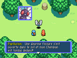 Au sortir du donjon, sa maman vous remercie d'avoir sauvé son enfant, pendant que le petit Chenipan vous admire pour votre courage. Papilusion vous offrira une Baie Fraive, une Baie Oran et une Baie Pêcha ! N'ayant nulle part où aller, votre nouvel ami vous demandera alors ce que vous comptez faire actuellement, et ne sachant pas où aller, vous proposera alors de le suivre pour qu'il vous emmène dans un endroit où vous pourrez vous reposer.