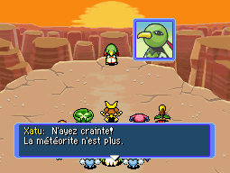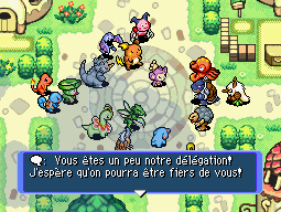 Elle vous explique donc que les Pokémon ont appris que leur monde était en danger et qu'ils étaient alors à la recherche d'un sauveur. Désespérés de ne trouver personne, ils tombèrent finalement sur un être humain, qui n'est autre que vous ! Bien que vous disiez ne pas en avoir l'étoffe, les Pokémon vous dirent alors que ce qu'ils cherchaient, c'était une personne courageuse. Acceptant alors leur requête, vous avez vous-même demandé qu'on vous transforme en Pokémon et qu'on vous efface la mémoire. Ce rôle de sauveur prendra fin une fois la météorite détruite et vous pourrez alors rentrer chez vous. Ce qui veut également dire que vous devrez dire adieu à votre partenaire.