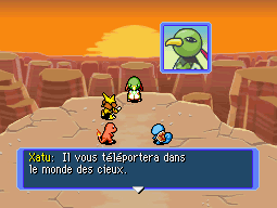 Après qu'Alakazam a posé la question, Xatu révèle qu'il n'existe qu'un seul moyen pour sauver le monde : demander l'aide de Rayquaza, un Pokémon Légendaire vivant dans les cieux. Xatu propose alors à Alakazam d'amplifier leurs pouvoirs psychiques afin d'avoir la capacité de téléporter des Pokémon là-haut. Votre partenaire auto-désigne votre équipe pour la mission, chose qui sera acceptée par Alakazam. Xatu prévient alors que votre départ s'effectuera le lendemain et qu'il vous est conseillé de vous reposer entretemps.