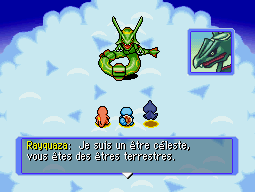Même une fois battu, il refusera de vous écouter, jusqu'à ce qu'un séisme se fasse ressentir, chose que Rayquaza corrige en disant que c'est une onde de choc. Le Pokémon Légendaire décide enfin de vous écouter et de lever la tête pour voir la météorite prête à s'écraser, raison de votre présence ici. Rayquaza vous prévient alors que s'il utilise son Ultralaser ici, vous risquez de succomber à cause de la proximité. Comme vous étiez déjà prévenus, Rayquaza lance alors son attaque.