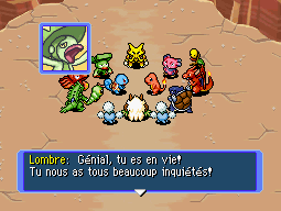 Vous vous réveillez dans un monde obscur après avoir été emporté par l'explosion de la météorite. Ectoplasma fait alors son apparition et décide de vous emporter dans le monde des ténèbres. Après un bref parcours, il décide de vous abandonner là où vous êtes, disant s'être trompé de chemin. Quelques instants plus tard, vous vous réveillez réellement sur la Colline des Anciens avec votre partenaire, entourés par vos amis de la Place Pokémon. Votre coéquipier vous demande si c'est Ectoplasma qui vous a également sauvé, un peu perturbé. Mais vous êtes en vie, et votre mission a été un succès !