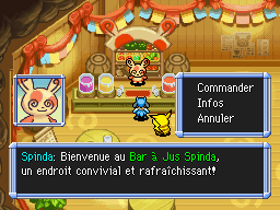 Le Bar à Jus se trouve dans le stand à gauche et vous permet de transformer vos aliments consommables en boisson. Ces boissons, dépendant de l'ingrédient utilisé, permettent de booster le QI ou des statistiques. C'est également Spinda qui vous donne les Cadeaux des Pokémon à qui vous avez donné un Don du Ciel.