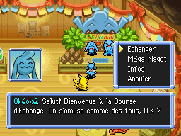 La Bourse d'Échange tenue par Okéoké et Qulbutoké se trouve dans le stand à droite, et permet de se débarrasser d'objets communs comme des Pomme et des Baies Oran contre des objets plus utiles. Vous pouvez également participer à des loteries qui peuvent vous faire gagner des objets utiles ou rares.