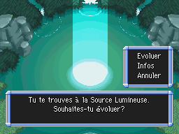 La Source Lumineuse se trouve au fond de la Forêt Trompeuse, le donjon où vous devez passer votre examen de la Guilde (vous y aurez un accès direct après l'événement). Pendant l'histoire, vous y verrez Teddiursa et Ursaring s'y rendre. Teddiursa évoluera alors en Ursaring. Votre partenaire essaiera également d'évoluer lui aussi, mais la Source lui dira qu'il y a un problème dans l'espace qui l'empêche d'évoluer, commençant ainsi la deuxième histoire du jeu. Vous ne pourrez évoluer qu'après avoir débloqué le donjon "Station Marine".Vous ne pouvez pas faire évoluer plusieurs Pokémon à la fois, vous devrez y retourner à chaque fois qu'un Pokémon évoluera. Contrairement aux premiers opus, vous n'êtes pas obligé d'être le meneur pour évoluer, ce qui veut dire que votre équipe ne doit pas être dissoute. Elle le sera seulement si vous faites évoluer un Pokémon composant votre équipe.