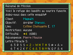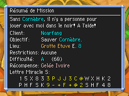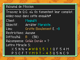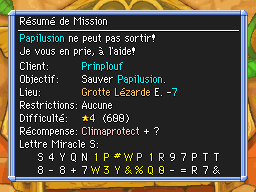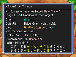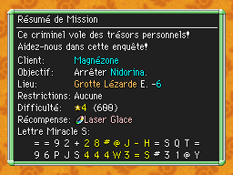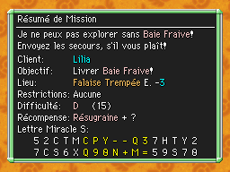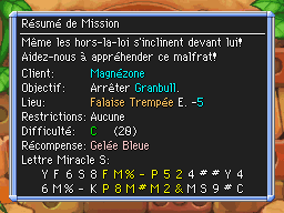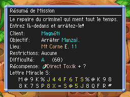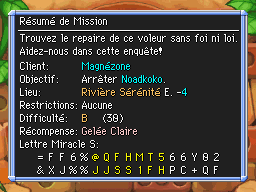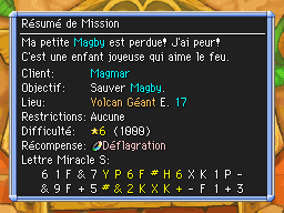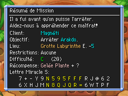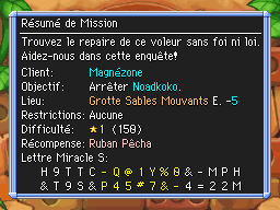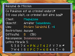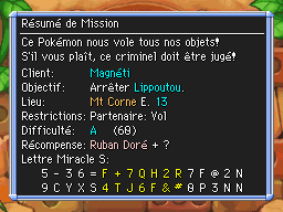 ![]() | 93SS3 J-YS6KY &9XP& W&R=K 1&PP0HW %FR3= | Lettre Défi de Maganon Cette mission vous est confiée par un Pokémon que Maganon a contacté pour qu'il puisse vous la remettre. Cette mission présente un tout nouveau type de mission : les Lettres Défi. Cela consiste à combattre une autre équipe d'exploration et permet de gagner beaucoup de points d'expérience. |