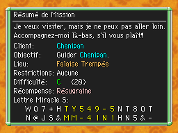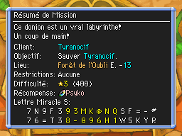 ![]() | %&X9X M&H36&C 0+4RH TY%9@ 7WP=M0M CK6S8 | Recherche de la Pièce Mystère Cette mission vous est confiée par un Pingoléon, et consiste à l'accompagner dans une prospection dans la Forêt Linceul. A l'issue de cette prospection, vous ramasserez une Pièce Mystère, un objet déjà indispensable dans Temps & Ombre pour pouvoir recruter certains Pokémon Légendaires. |