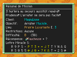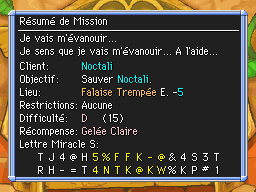 ![]() | 6#009 -33&0C# TTMN5 697F- 4R70P56 7+NW- | Recrutement de Tyranocif Cette mission vous est confiée par un Tyranocif, mais les modalités restent inconnues. Toutefois, il semblerait qu'à la fin de la mission, Tyranocif demandera de rejoindre votre équipe d'exploration. Pour rappel, Tyranocif n'est disponible que dans la Grotte Sables Mouvants fond et possède un taux de recrutement de -12%. |