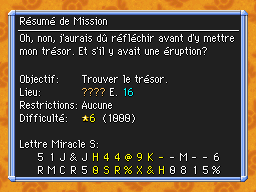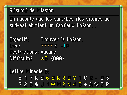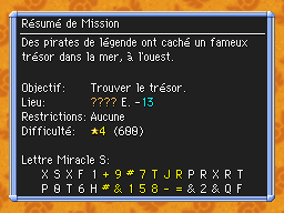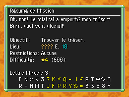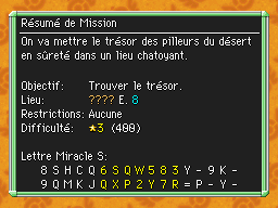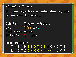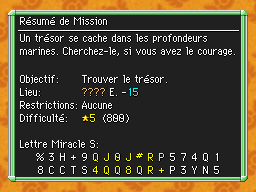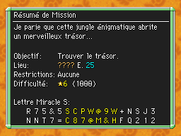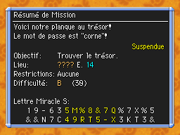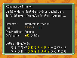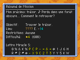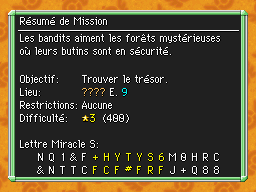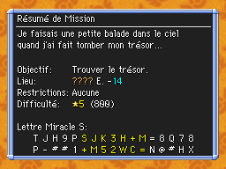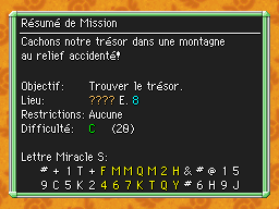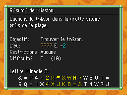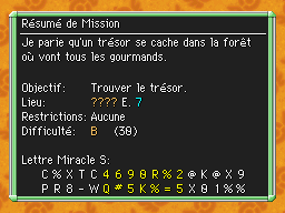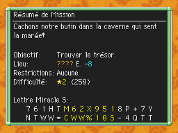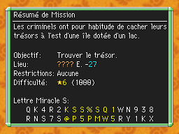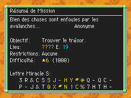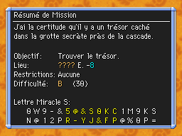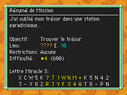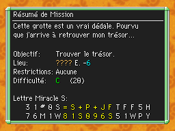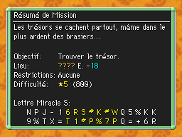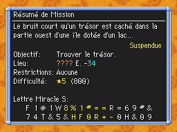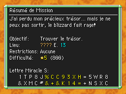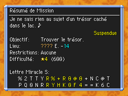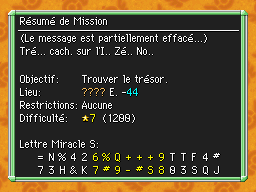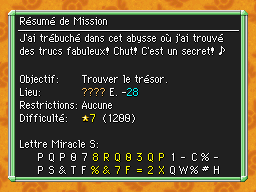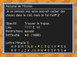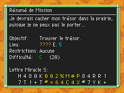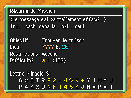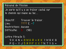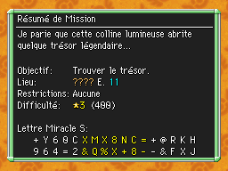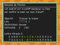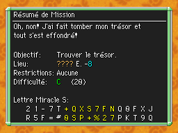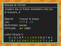 Les Mémos Trésor sont des missions où vous devez trouver un trésor caché dans un donjon. La localisation de ces mémos est indiqué par un "???" mais l'étage sera toujours indiqué, ainsi que la difficulté de la mission. Pour savoir où se trouve le trésor, déchiffrez la phrase de description !Vous pourrez retrouver des exemples plus bas dans la page.