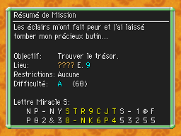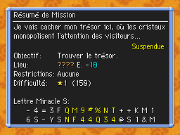Voici rien que pour vous une liste de Mémos Trésor ! Recopiez le code des Lettres Miracles S dans le menu pour pouvoir les élucider ! Pour avoir une liste de tous les Mémos Trésor obtenus pendant la rénovation du dossier, dirigez-vous vers ce lien !Recherche