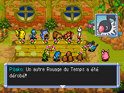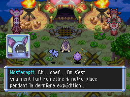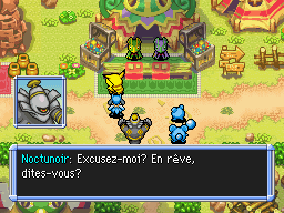 De retour à Bourg-Trésor, vous rendez l'Hydroflotteur à Marill et Azurill. Puis vous expliquez à Noctunoir les visions que vous avez. Noctunoir vous explique qu'il s'agit du Cri Dimensionnel. Puis votre partenaire lui demande des précisions sur votre amnésie. En souriant, Noctunoir vous dit qu'il n'a aucune idée de votre origine, mais ne serait-il pas en train de… mentir ?