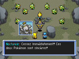 Au fond des Plaines Elek, vous trouvez l'Hydroflotteur, mais aussi une horde de Dynavolt et Elecsprint qui vous attaquent ! Lancez une Roupigraine à Elecsprint, débarassez-vous des Dynavolt de gauche en premier, et tout ira bien. Noctunoir met en fuite les Dynavolt puis l'Equipe Crâne qui avait tout manigancé.
