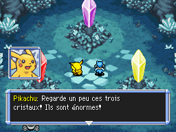 Une fois dans les Profondeurs de la Caverne, vous êtes face à trois cristaux. Interagissez avec jusqu'à avoir trois cristaux bleus. Vous entrez dans le Croisement Cristal. Il vous mène au Lac Cristal.