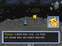 Vous vous réveillez dans un monde gris et figé : le futur. Une animation vous montre Noctunoir parlant avec Dialga d'une… exécution ! L'exacution des « traîtres ayant cherché à modifier le cours du temps » ! Espérons qu'il s'agisse de Massko et non de vous ! Dès que vous avez la main sur vos déplacements, essayez d'ouvrir la porte de votre cellule.