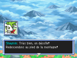 Sommet : des Tadmorv et des Grotadmorv ont pollué le sommet ! Il vous faut les battre pour les faire partir. Une fois qu'ils ont vidé les lieux, Shaymin purifie l'environnement et fait pousser des Gracidées. Vous redescendez du Pic en volant avec Shaymin.