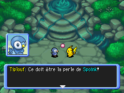 Vous découvrez votre deuxième donjon, la Falaise Trempée. Il n'est pas difficile si vous utilisez des capacités. Tout au fond, vous trouverez la perle de Spoink, qui vous donnera de belles récompenses. Vous gardez tous les objets, mais seulement 10% des pièces, le reste allant à la Guilde.