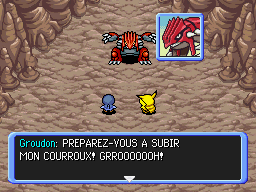 Vous affrontez Groudon au sommet du Pic tandis que la Guilde vous rejoint. Essayez de lui lancer (à Groudon, pas à la Guilde) des graines (Hallucigraine, Pétrigraine…) pour l'occuper pendant que vous l'attaquez.