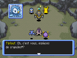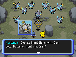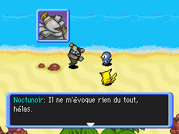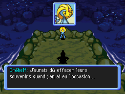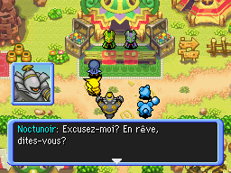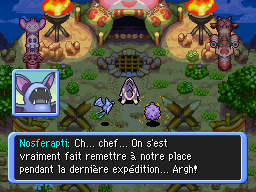 De retour à Bourg-Trésor, vous rendez l'Hydroflotteur à Marill et Azurill. Puis vous expliquez à Noctunoir les visions que vous avez. Noctunoir vous explique qu'il s'agit du Cri Dimensionnel. Puis votre partenaire lui demande des précisions sur votre amnésie. En souriant, Noctunoir vous dit qu'il n'a aucune idée de votre origine, mais ne serait-il pas en train de… mentir ?