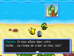 Vous atterrissez sur la plage près de Bourg-Trésor. Comme vous ne pouvez pas ramener Massko à la Guilde de Grodoudou, vous allez vous installer dans l'ancienne maison de votre partenaire, sur la Falaise Sharpedo.