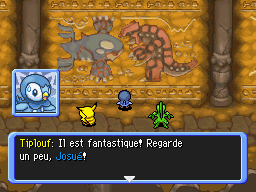 Vous arrivez aux Runies Anciennes, où des peintures rupestres représentent des Pokémon légendaires comme Mew, Kyogre, Groudon… Le Vaisseau Arc-en-Ciel, qui permet d'atteindre la Tour du Temps, n'est plus très loin.
