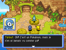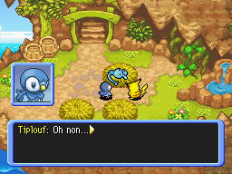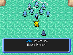 Le lendemain matin, l'Oeuf éclot et il en sort Manaphy ! Allez voir Pijako pour en savoir plus à son sujet. Manaphy se met tout à coup à pleurer. Vous souvenez-vous des Gelées Bleues qui étaient recommandées de mettre de côté sur la page principale de la soluce ? C'est maintenant qu'elles vont servir.