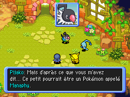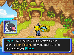 Donnez une Gelée à Manaphy et acceptez de vous en occuper pendant quelques temps. Pijako n'est pas d'accord mais tant pis. Une fois dans votre base, donnez la deuxième Gelée Bleue à Manaphy.