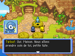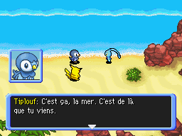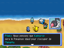 Une fois Manaphy bien nourri, amenez-le se promener à la Plage. Le lendemain, Manaphy a disparu ! Vous le trouverez à la Plage. Il est brûlant de fièvre !